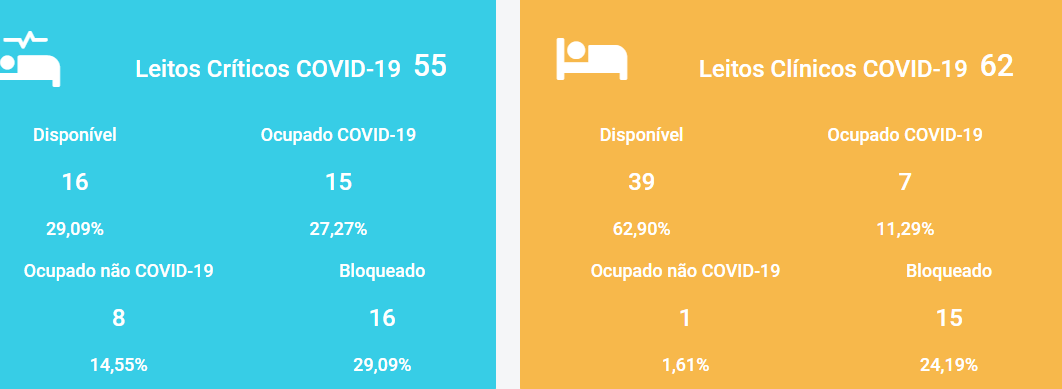 Até o momento desta publicação são 16 leitos críticos (UTI) disponíveis e 15 ocupados, enquanto em relação aos leitos clínicos (enfermaria), são 39 disponíveis e 7 ocupados.