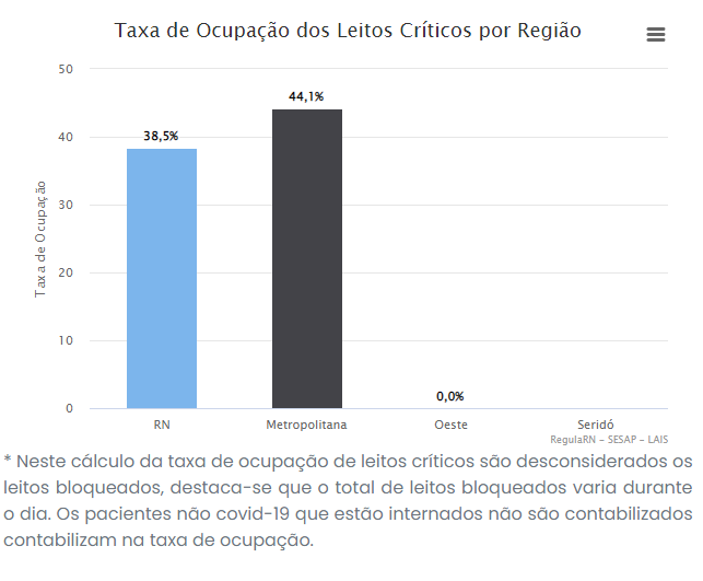Segundo a Sesap, a Região metropolitana apresenta 44,1% dos leitos críticos ocupados, a região Oeste tem 0% e a Região Seridó tem 0%.
